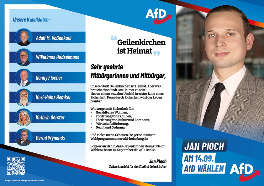Wählen Sie am 14.September eine Alternative für unsere Heimat, für Geilenkirchen. Mit freundlichen Grüßen Jan Pioch Hier entlang geht’s zum Wahlprogramm: https://afd-kommunalpolitik. de/wp-content/uploads/2025/06/ Broschuere_Kommunalwahl-NRW_Basis_DRUCK-2.pdf #kommunalwahl2025 #AfD #geilenkirchen #wahlkampf #afdwählen
