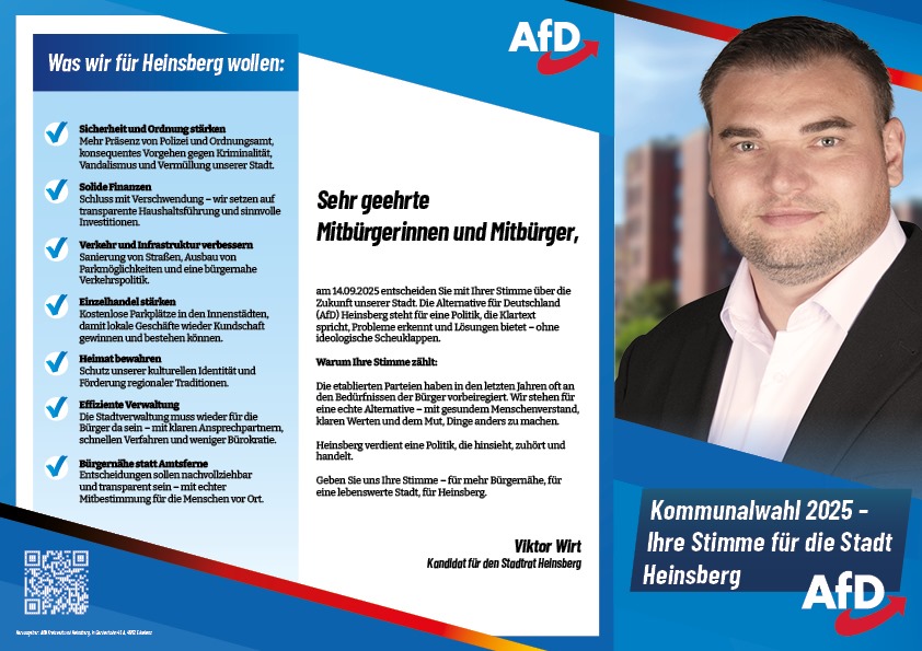 am 14.09.2025 entscheiden Sie mit Ihrer Stimme über die Zukunft unserer Stadt. Die Alternative für Deutschland (AfD) Heinsberg steht für eine Politik, die Klartext spricht, Probleme erkennt und Lösungen bietet – ohne ideologische Scheuklappen.